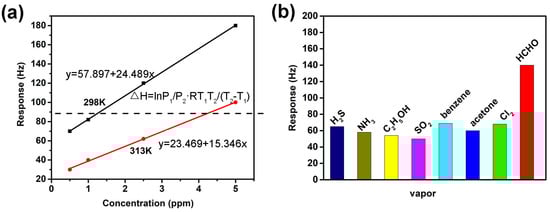 (a) Based on the experimental results in Figure 10a,c, two isotherms were plotted to calculate the adsorption heat (ΔH), (b) response of PANI-CNC-based QCM to different vapors in 3 ppm (25 °C).