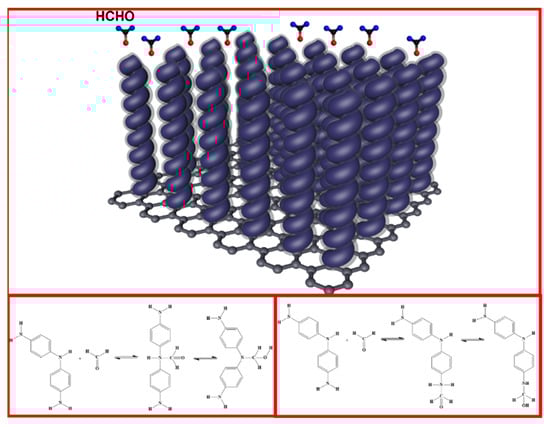 The high response/recovery performance was attributed to the fact that the formaldehyde molecules quickly diffused in the array PANI-CNCs. Moreover, the helical PANI-CNCs reinforced the Knudsen diffusion, which increased the probability between the formaldehyde molecules and the PANI layer, which in turn lead to the high response and low detection limits. As shown in Figure 12, the –NH– group and the –NH2 group acted as active sites in the Schiff-base reaction and caused the formaldehyde molecules to be absorbed on the surface of the PANI-CNCs. Both the quick diffusion of the formaldehyde molecules between the array PANI-CNCs and the Schiff-base reaction between the –NHx (–NH– and –NH2) and the formaldehyde molecules lead to a good detection performance.