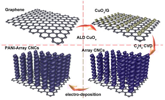 After Cu-based catalysts were processed by ALD, the Cu catalysts were transferred into a tube furnace equipped with a quartz tube (60 mm × 1100 mm). The CNCs’ growth temperature was set as 250 °C, at a rate of 10 °C/min, in an H2/Ar (5%/95%) atmosphere. The CNCs’ growth time was 30 min under atmospheric pressure, as shown in Scheme 1. The obtained CNCs were transferred to the HNO3 (68 wt%) solution at 100 °C for about 2 h in order to remove the Cu catalysts. Subsequently, the CNCs were filtered and dried. Finally, the CNCs were dispersed in ethanol for further study.