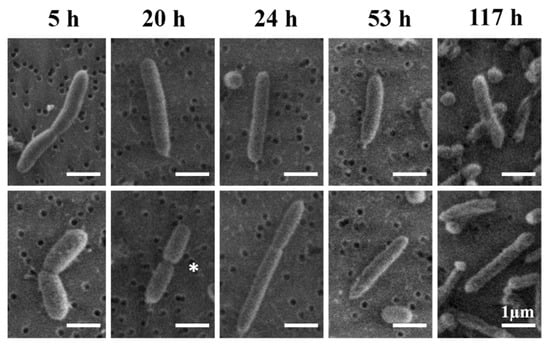 Scanning electron microscopy (SEM) images illustrating the cell division pattern throughout the life cycle of a V. fischeri population. The depicted timepoints correspond to the lag (5 h), exponential (20 h and 24 h), stationary (53 h), and death (117 h) phases (see Figure 1A). The full-grown adult cells of ca. 2 µm length are observed at 53 h. Cells undergoing division are commonly observed only in the first two phases (5 h, 20 h, and 24 h); * clear example of a septum in the exponential phase (20 h). Dark round features in the background are ca. 0.2 µm pores in the supporting polycarbonate filter.