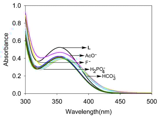 UV-Vis screening experiments of L with anions (F−, Cl−, Br−, I−, HSO4−, H2PO4−, HCO3−, AcO− and NO3−) have been performed in DMSO using appropriate concentrations of L and anions. As shown in Figure 1, a significant change in the absorbance (A) and/or λmax has been observed for L after the addition of F−, H2PO4−, HCO3−, AcO−, suggesting that the receptor effectively binds an anion possibly through hydrogen bonding interactions. The λmax of the free receptor L (354 nm) has been shifted to 360 nm (F−), 365 nm (H2PO4−), 360 nm (HCO3−) and 356 nm (AcO−). The bathochromic shifts (Δλ) due to the addition of anions are listed in Table 1.