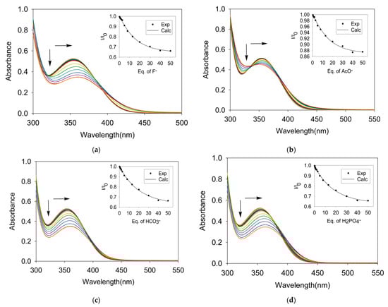 As shown in Figure 2, similar spectral changes are observed titrating the receptor with acetate, bicarbonate and dihydrogen phosphate, displaying isosbestic points at 382, 398 and 390, respectively. For the addition of nitrate and hydrogen sulfate, the absorption decreases without showing an isosbestic point. The variation of the absorbance as a function of the anion concentration resulted in the best fit for a 1:2 binding model [45] for each of the oxoanions. Selected titration curves and binding constant plots are shown in Figure 2. Additional titration curves and plots are provided in Supplementary Materials. The overall binding magnitude of the receptor does not show much difference for acetate (log β = 4.97), bicarbonate (log β = 4.58) and dihydrogen phosphate (log β = 4.71), which could be due to the flexible nature of the receptor. The binding constants are listed in Table 2, exhibiting the highest binding for acetate among oxoanions with the binding order of acetate > dihydrogen phosphate > bicarbonate > hydrogen sulfate > nitrate, agreeing with the reported binding trend for other neutral receptors [21,22].