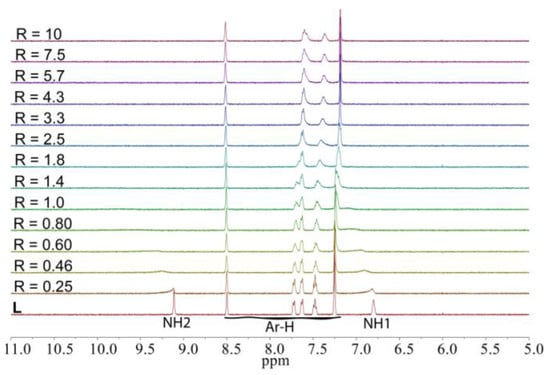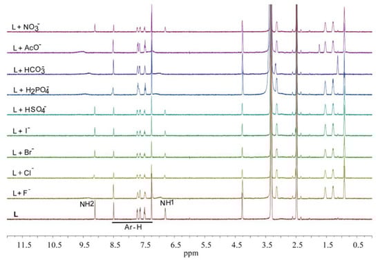Binding interactions between the receptor L and anions have also been investigated through 1H NMR experiments in DMSO-d6 at room temperature using the corresponding tetrabutyl ammonium salts. Figure 4 shows the NMR screening spectra of L (2 mM) against various anions, as performed from the addition of one equivalent of an anion to the receptor. Two distinct NH resonances for the free L appear at 9.11 and 6.80 ppm in the 1H NMR spectrum. These NH groups can act as H-bond donors to bind an anion forming a receptor–anion association complex. In addition, the presence of the appended nitro groups in the aromatic rings could enhance the hydrogen-bonding capabilities by increasing the acidity of the NH binding sites. In the 1H NMR studies, these protons (NH) have closely been monitored by titration experiments. During the screening experiment, it is observed that the NH protons are disappeared after the addition of fluoride, while for chloride, dihydrogen phosphate, bicarbonate and acetate, the protons’ resonances have been shifted downfield (higher δ ppm value). This observation suggests that the receptor effectively responses to fluoride, acetate, bicarbonate, dihydrogen phosphate and chloride anions, possibly due to the H-bonding interactions between the receptor and an added anion. However, for other anions (bromide, iodide, hydrogen sulfate and nitrate), the protons’ peaks are not observed to shift significantly (Supporting Materials), indicating weak host–guest interactions under the experimental conditions used for 1HNMR titrations.