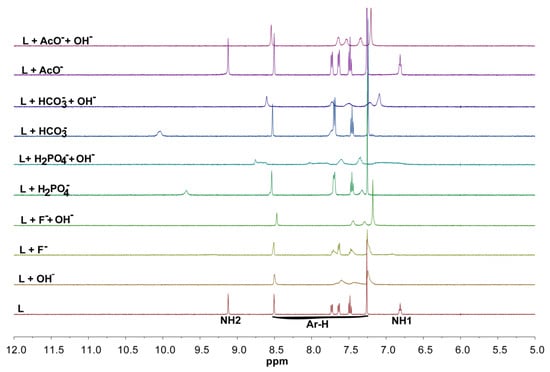 In order to estimate the binding constants of L, proton NMR titrations have been performed by adding systematic addition of various anions to the receptor using DMSO-d6 as a solvent. Figure 5 shows the stacking of 1H NMR titration spectra of the receptor upon the incremental addition of fluoride, showing a progressive downfield shift of both NH protons during the first few additions of the anion, demonstrating a typical hydrogen-bonding interaction of the receptor with fluoride. As can be seen, both the –NH resonances have been initially broadened and almost disappeared from the addition of less than one equivalent of fluoride. On the other hand, the aromatic protons showed slight upfield shifts. This observation is consistent with several previous studies, which could be due to the net proton transfer of NH to highly basic fluoride [46,47,48,49]. It is possible that the receptor initially binds a fluoride during the first few additions, which ultimately undergoes deprotonation at the higher anion concentrations to form a HF2‒ species [49]. A control experiment with a more basic hydroxide anion has been performed in the presence of fluoride as well as other selected anions. As shown in Figure 6, the addition of one equivalent of hydroxide anion resulted in a complete disappearance of both acidic NH protons and an upfield shift of the aromatic proton resonances due to the deprotonation of NH sites caused by the acid-base interactions [42,49]. This NMR spectrum is almost similar to that obtained from the addition of one equivalent of fluoride to L, suggesting the deprotonation of NHs by the added fluoride anion. The addition of hydroxide anion to the mixture of L with fluoride also showed the disappearance of NH resonances along with a further upfield shift of aromatic protons. On the other hand, the NH signals that are clearly shown after the addition of one equivalent of acetate, dihydrogen phosphate or bicarbonate, disappear due to the addition of one equivalent of hydroxide anion, suggesting that the binding event is changed to the deprotonation process caused by the highly completive basic hydroxide anion. It has also been reported that a receptor in the presence of a high concentration (e.g., used in 1H-NMR titrations), the acidic –NH group could undergo a deprotonation process in the presence of a strong basic anion; while under more diluted conditions, an effective anion binding could be observed (as during UV-Vis titrations). Thus, the interactions during the UV titration of the receptor with fluoride could be classified as a binding process.