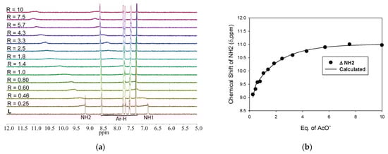 For all other anions, the NH peaks remain visible with the progressive downfield shift of NH protons until the end of the titrations, while the aromatic protons show negligible changes. NH protons are used to calculate the binding constants. The partial 1H NMR titration spectra of L showing changes in the NH chemical shifts with an incremental addition of acetate, bicarbonate, dihydrogen phosphate and chloride follow similar trends (Figure 7 and Supporting Materials). The variation of NH resonances, as analyzed by the non-linear regression method [45], demonstrates that the receptor binds each of these four anions in a 1:2 binding fashion. On the other hand, an insignificant change in the chemical shift resonances has been observed due to the addition of bromide, iodide, hydrogen sulfate and nitrate, hampering the determination of binding constants. The calculated binding constants as obtained from the NMR titrations studies are listed in Table 2, showing the binding constants (in log β) of 4.48, 4.63, 4.54 and 4.96 for chloride, dihydrogen phosphate, bicarbonate and acetate, respectively, which are approximately close to those obtained from the UV-titrations. A similar anion binding order was observed by previously reported 4-nitrophenyl-based molecular clefts with an m-xylene linker [8]; however, the receptor L exhibits overall strong affinities for anions because of its ability to bind two anions simultaneously as opposed to one anion that was shown by the reported receptors. A slight variation of the results obtained from the two different techniques could be due to the different conditions used for UV-Vis and 1HNMR titrations [46]. Nevertheless, the binding order as acetate > dihydrogen phosphate > bicarbonate > chloride that acquired from 1HNMR titrations parallels with that obtained from UV-Vis, showing the highest binding of the receptor for acetate.