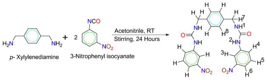 The new urea-based anion receptor (L) with four NH donor centers was designed and synthesized in pure powder form by a single-step reaction between p-xylylenediamine and 3-nitrophenyl isocyanate as depicted in Scheme 2. To be an effective anion receptor, the molecule should have an ideal combination of binding sites and an appropriate cavity size to complement a certain anion (Scheme 1). In general, neutral anion receptors have such functionalities and properties that can bind an anion selectively over other anions, principally by H-bonding and utilizing different other types of non-covalent interactions, such as π-π* interactions, ion–dipole interactions and electrostatic interactions [41]. In this case, the ligand L has four NH groups as active binding sites possessing excellent H-bonding capabilities, suitable to coordinate an anion within the receptor’s framework. In addition to the four –NH groups as binding sites, the anionic host L has two m-nitro phenyl groups, making it an effective candidate for anion recognition and sensing in solution.