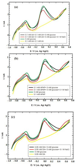 (a) Linear sweep voltammetry (LSV) curves of 5 mM glucose/0.1 M NaOH in the absence and the presence of 0.1 mM ascorbic acid (AA), 0.1 mM uric acid (UA) and 0.1 M NaCl at graphite/SrPdO3/AuNPs. (b) LSV curves of 5 mM/0.1 M NaOH in the absence and the presence of 0.1 mM N-acetyl-para-aminophenol or paracetamol (APAP) and 0.1 M NaCl at graphite/SrPdO3/AuNPs. (c) LSV curves of 5 mM glucose/0.1 M NaOH in the absence and the presence of 0.05 mM dopamine (DA) and 0.1 M NaCl at graphite/SrPdO3/AuNPs [43]. Reproduced with the permission from Elsevier.