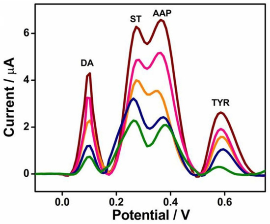 Interference measurement of LaNiO3/carbon paste electrode (CPE) sensor using diffential pulse voltammetry (DPV) technique in 0.1 M PBS of pH 7 containing varying concentrations of DA (from green to garnet curve 0.005 to 0.045 mM), serotonine (from green to garnet curve 0.03 to 0.17 mM), acetaminophen (from green to garnet curve 0.03 to 0.09 mM), and tyrosine (from green to garnet curve 0.0008 to 0.04 mM) [49]. Reproduced with the permission from Elsevier.