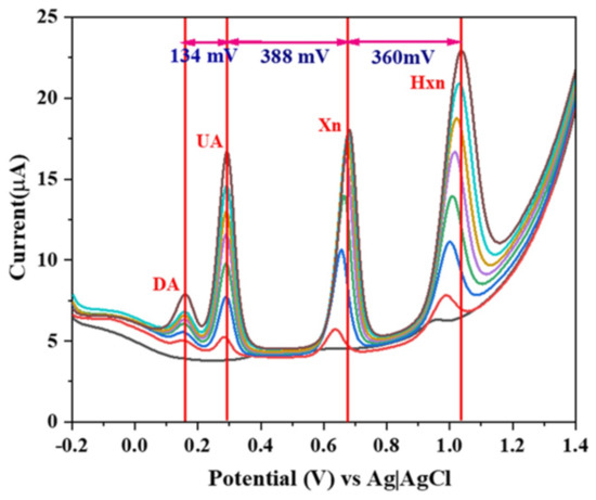 DPV response of a β-NaFeO2-modified carbon paste electrode at different concentrations of DA (from red to black curve 10 nM to 70 nM), UA (from red to black curve 5 µM to 200 µM), Xn (from red to black curve 5 µM to 200 µM), and Hxn (from red to black curve 5 µM to 200 µM) [55]. Reproduced with the permission from Elsevier.