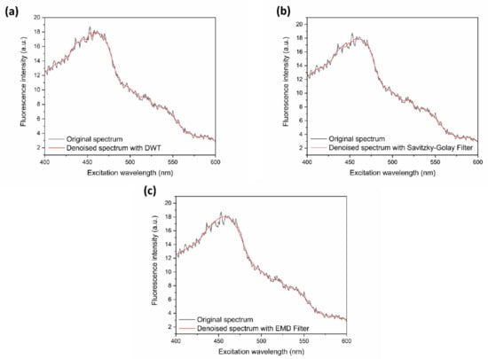 Excitation fluorescence spectra before and after noise removal based on three different denoising methods: (a) with soft threshold quantization under db10 wavelet at the third level (discrete wavelet transformation (DWT)), (b) with the Savitzky–Golay Filter, and (c) with the empirical mode decomposition (EMD) filter.
