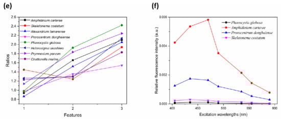 Feature extraction followed these three steps: First, the excitation fluorescence spectra were recorded to acquire an idea of spectral similarities and differences among the assessed eight species of algae. Second, typical excitation wavelengths of marker pigments were selected based on the photosynthesis principle of algae and the characteristic peaks of absorption spectra of each pigment []. Third, the positions of peaks and troughs of excitation spectra were determined in different algae. After combining all selected wavelength positions, a new discrete excitation fluorescence spectrum with less typical excitation wavelengths was established for each algal sample to further identification and quantification.