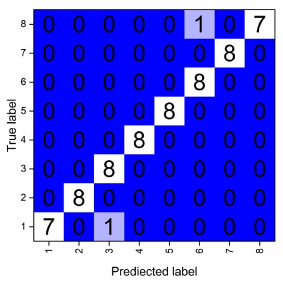 The new discrete characteristic excitation spectra were set as feature spectra for training the Softmax Classifier model. To train and test the model, 80 monocultures of each species were cultured in the same environmental conditions and were randomly classified into training sets and validation sets according to a ratio of 7:1. Another eight pure samples of each were used as testing sets. In total, there were 560 training samples, 80 validation samples and 64 testing samples. The number of excitation wavelengths was reduced each time. When the number of wavelengths had been reduced to seven, the identification accuracy of the validation sets of monocultures exceeded 90%, and the accuracy of the test sets of monocultures reached 88.2%. This represents a comparatively improved recognition result. Therefore, discrete excitation wavelengths of 405, 435, 470, 490, 535, 555, and 590 nm were selected for establishing feature spectra (Figure 4d).