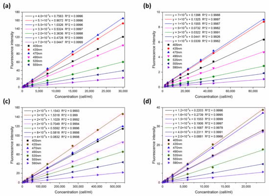 Linear function between fluorescence intensity and concentration at seven characteristic excitation wavelengths for four species of algae: (a) Amphidinium carterae (toxic algae); (b) Phaeocystis globose (toxic algae); (c) Skeletonema costatum (non-toxic algae); and (d) Prorocentrum donghaiensis (non-toxic algae).