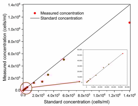 After confirming species, the norm spectrum was used to calculate the cell density by the model. With all designed concentration ratios, only the dominant species were targeted (Figure 7). The black line was fitted by standard concentration and the red circles indicate measured concentrations. In general, the red circles are quite close to the standard, especially at the initial part of the axis where the cell densities are below 5.35 × 104 cells/mL. More details of the results are shown in Table 7.