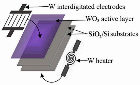 The microstructure, electrical properties, and stoichiometry of the WO3 active layer have a strong influence on the sensor characteristics and are driven by the deposition and the annealing conditions. Then, the WO3 resistivity is strongly influenced by its stoichiometric defects [8]. Several methods have been used for the elaboration and deposition of tungsten oxide films: thermal evaporation [9], sol–gel [10], pulsed electro-deposition [11], and radio-frequency sputtering [12,13], among others. RF sputtering is a widely used technique for the deposition of WO3 thin films. Reactive sputtering from a metallic target gives thin films with a good oxygen stoichiometry [12]. In opposition, the non-reactive sputtering can give oxygen-deficient oxide films when they are deposited at low argon pressure from a metal–oxide target [14,15]. Very few data about WO3 thin films deposited by RF non-reactive sputtering from a tungsten oxide target and their utilization in gas-sensing applications can be found in the literature.