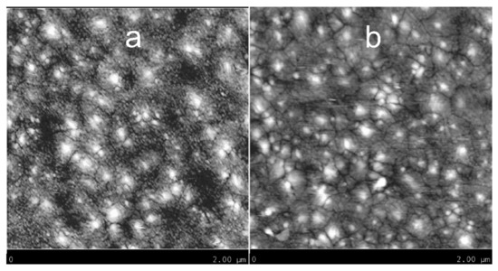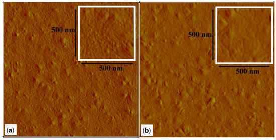 The surface of WO3 films annealed at 400 °C and 500 °C was observed by AFM to understand how the annealing temperature affects the morphology of the films. Figure 4a,b show the surface microstructure over a 2 µm × 2 µm area. As shown in Figure 4a and its inset, the sample annealed at 400 °C presents a granular surface composed of very small grains, from 14 to 28 nm, and some bigger ones, from 42 to 70 nm. Figure 4b and its inset show the surface of the film annealed at 500 °C. Here, the amount of very small grains has decreased due to the higher annealing temperature. The bigger grains range from 48 to 98 nm. The size of the biggest grains is well correlated to the crystallite sizes given in Table 2 for the two films. The r.m.s. roughness is quite similar for both films, 1.40 nm for the sample annealed at 400 °C and 1.33 nm for the other one. These values of roughness indicate that both films are very smooth. That also suggests the grain growth is very limited in the c-axis when the annealing temperature increases. In fact, the bigger grains have grown in directions parallel to the substrate. So, this particular growth did not significantly affect the roughness of films. To have additional information about the film microstructure, we have applied a numerical treatment to the original AFM images. The treated images are presented in Figure 5. The film annealed at 400 °C is effectively composed of very tiny grains. However, the most important difference can be seen in Figure 5b, where the film annealed at 500 °C reveals bigger grains with well-marked grain boundaries. For both films, the thickness is about 120 nm. The FESEM images used for this measurement by observation of the cross-section are not presented here.