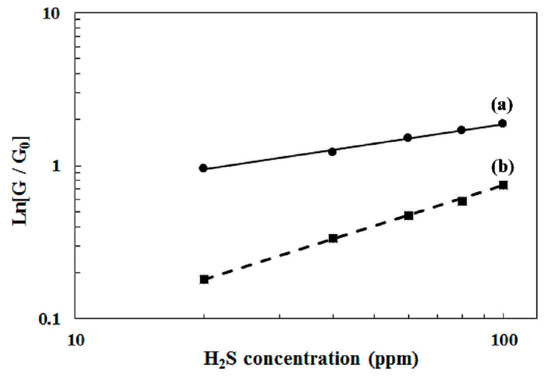 Sensitivity of sensor-400 (a) and sensor-500 (b) versus the H2S concentration at 350 °C. The dots are experimental values. The lines are the fitting curves obtained with Equation (10).