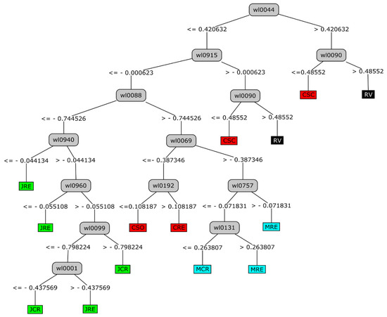 The classification model based on DT has been developed with the tree structure shown in Figure 2. This DT classification model represents all possible paths in the tree created as a result of the process of prediction model creation, based on a J48 DT classifier. This model has the categories in the leaves of the tree structure and the attributes (in this case, the wavelengths of the UV-Vis spectra) in the decision nodes. Figure 2 shows the 13 rules created that represent all possible paths in the DT with the vinegar samples considered in the study, which was created as a result in the process of prediction model creation based on a J48 classifier.