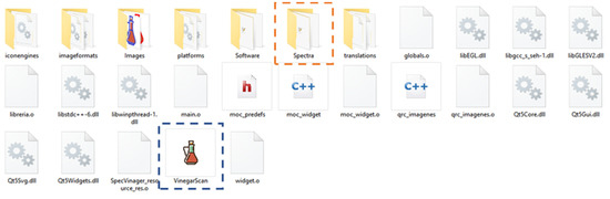 As shown in Figure 4, when the .zip folder is extracted as the first step of the installation, different folders and files are found inside. The two with utility for the user are the folder called “Spectra”, where the user can find a set of different samples used to test the tool, and the executable file “VinegarScan” symbolized by a vinegar bottle, which is the tool to be used. In addition, the same icon of the vinegar bottle will appear in the Windows status bar.