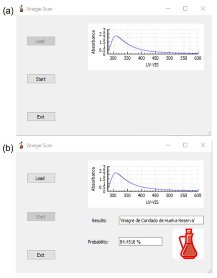 Screens of the VinegarScan GUI: (a) screen once the spectrum has been loaded; (b) screen once the analysis has been performed by pressing the Start button.