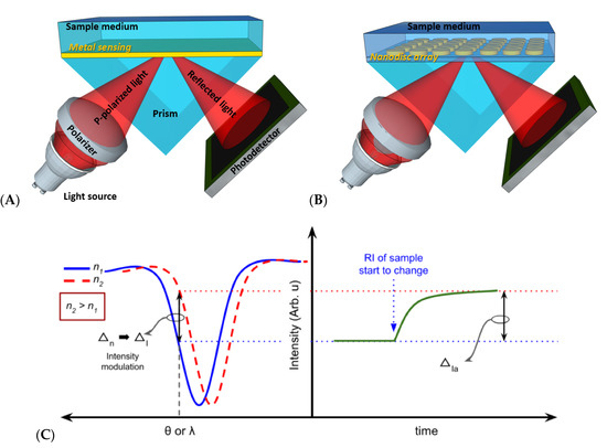 (A) SPR sensor configuration using a prism coupler and thin metal film for the sensing layer. (B) LSPR sensor using a nanodisc array. Signal acquisition of SPR sensor performed using (C) intensity modulation and (D) angular or wavelength interrogation. (C,D) are reprinted from [29] under the Creative Commons Attribution (CC BY) license.