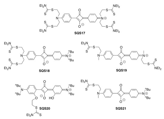 Structures of thiocarbamate-containing SQS17 [75], SQS18 [76], SQS19 [77], SQS20 [78], SQS21 [79].