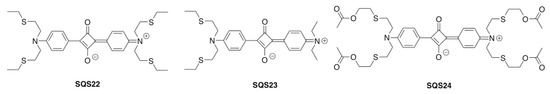 Additionally, a number of other thio-containing podands, in particular, those containing a thiocarbamate moiety, had been conjugated onto the squaraine’s scaffold and produced Hg2+-specific sensors, which appeared to have “turn-ON” responses (Figure 3). Symmetric SQS17 showed strong absorption (λabmax = 644 nm) and emission (λemmax = 661 nm) bands in organic solvents (CH2Cl2, CHCl3, AcOH), which were indicative of a monomeric structure [75]. In aqueous solutions, aggregates of SQS17 were noted; for example, the purple-colored solution of SQS17 in the AcOH–H2O mixture (4/6 v/v), with a broad absorption range of 500–700 nm (λabmax = 548 nm), showed no transitions above 650 nm in the emission spectrum. However, upon the addition of a Hg2+ salt, a change from a purple- to blue-colored solution was noted, with the appearance of an absorption band at 636 nm, and a strong emission at 660 nm. These spectral changes indicated that the complexation of Hg2+ induced the formation of the monomeric form of SQS17. Importantly, other metals ions, which are also considered to be soft Lewis acids (e.g., Ag+, Cd2+, Pb2+), did not produce any noticeable changes, either in the absorption or in the emission spectra of SQS17. This suggested a lack of interaction with SQS17, as well as an inability of these ions to induce the disaggregation of SQS17. Therefore, SQS17 appeared to be a viable, selective, naked-eye Hg2+ sensor, which provided an emission enhancement of ca. 700-fold, affording a detection limit of 7.1 nM.