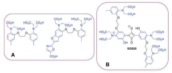 Structures of Ca-specific sensors. (A): original Ca indicators; (B): squaraine-containing SQS25 [86].