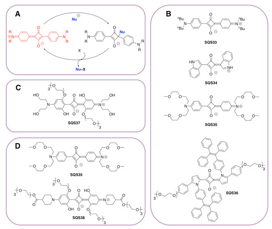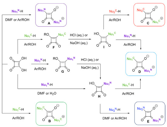 Conventionally, the symmetric squaraines A and B (Scheme 1) are obtained by reacting the corresponding nucleophiles (ca. 2 equiv.) with squaric acid [12,13,14]. A few general comments are noteworthy. When amines are used as N-nucleophilic components (NuN-H), primary amines mostly appear to be viable substrates [12], and only a handful of squaraines are produced upon the reaction of secondary amines with squaric acid [23]. In the case of aromatic amines, the electronic nature of substituents on the aromatic ring appears to have little effect on the efficiency of the reaction. However, only electron-rich aromatic C-nucleophiles (NuC-H) prove to be viable reagents for squaric acid; this is consistent with the electrophilic aromatic substitution conditions. For the synthesis of the C-arylidene type of squaraines (Figure 1), condensation reactions typically require the use of organic bases, such as quinolone and pyridine, to generate suitable nucleophilic species.