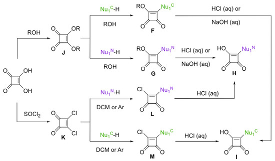 Squaryl chloride K could be efficiently produced upon the treatment of squaric acid with chlorinating agents, such as thionyl chloride [39,40], and, typically, as-prepared K could be used for subsequent steps, without any purification. The reaction between K and NuN1-H or NuC1-H nucleophiles produces the corresponding semisquaric acid chlorides L [41] and M [42,43,44,45], respectively. The subsequent acidic hydrolysis furnishes semisquaraines H and I [46,47,48,49], which could then be converted to squaraines following established protocols (Scheme 1).