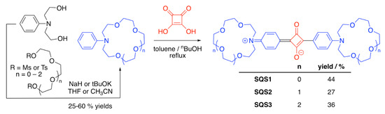 Crown ethers, as well as their nitrogen- and sulfur-containing analogues, are well-known receptors for a variety of alkaline and alkaline-earth (crown and aza-crown ethers), and transition and heavy metals (aza-crown and (aza)-thio-crown ethers) [51]. Synthetic routes to various functional crown ether motifs have been developed, which makes them suitable building blocks for chemosensor development [52]. Crown ether-containing squaraines have been prepared using a general method (Scheme 3) [53], following a condensation reaction between squaric acid and N-phenyl crown ethers [54,55,56].