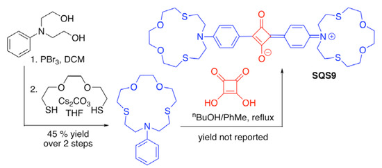 Sulfur-containing crown ethers are known hosts for a variety of heavy metal ions. Specifically, dithia-dioxa-aza-crown ether (Scheme 6, blue structure), which could be prepared in two steps, using commercially available materials [64], has been widely utilized as a Hg2+ and Ag+ recognition moiety on the fluorescent dye scaffolds, including BODIPY, rhodamine, and anthracene [65]. This crown ether was used to prepare SQS9, following a typical condensation procedure (Scheme 6) [66]. In aqueous solution (H2O:CH3CN 4:1, v/v), on the basis of the absorption spectra, both aggregated (λabmax = 560 nm; assigned as H-aggregates) and monomeric (λabmax = 647 nm) forms of SQS9 were observed to result in a purple-colored solution. Interestingly, upon the addition of five equivalents of thiophilic cation, such as Hg2+, Pb2+, and Ag+, drastically different spectroscopic responses of SQS9 were noted. In the presence of Hg2+, complete discoloration of the SQS9 solution and complete disappearance of the transitions above 500 nm took place. In several CH3CN/H2O mixtures, as well as in neat CH3CN, the limits of Hg2+ detection were within the 10–100 nM range. In the presence of Pb2+, no changes were observed. However, Ag+ appeared to promote the formation of the monomeric form of SQS9, as indicated by the presence of a 647 nm peak, and the formation of a green-colored solution. Not surprisingly, alkali, alkaline-earth, transition, and heavy metal ions (e.g., Li+, Na+, K, Mg2+, Ca2+, Cu2+, Zn2+, Cd2+, Ni2+, Fe3+), i.e., ions with virtually no affinity towards the softer version of crown ethers, did not cause any changes in the absorption spectrum of SQS9. The effect of Hg2+/Ag+ ions on the emission properties of SQS9 (λemmax = 667 nm, Φ = 0.13, τ = 0.67 ns in CH3CN) was not investigated [66]. It is worth noting that in neat CH3CN, SQS9 did show a bathochromic shift in the presence of Fe3+ (1 equiv.) and a hypsochromic shift in the presence of Cu2+ (1 equiv.) [58].
