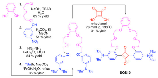 Polyether bridged squaraine SQS10 was synthesized in a straightforward manner, in five steps, starting with catechol (Scheme 7) [67]. Based on dynamic light-scattering data, as well as the absorption and emission profiles of SQS10 in CH3CN/H2O mixtures, SQS10 was shown to undergo significant aggregation when the water content was ≥10% (v/v). Thus, all the metal binding studies were conducted in a CH3CN/H2O mixture with a 9/1 ratio (v/v).
