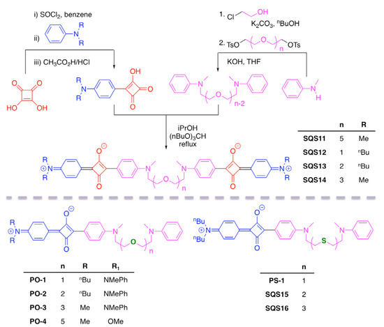 By adjusting the length of the ethylene glycol tether, several other podand-containing squaraine sensors, SQS12–SQS14, were prepared (Scheme 8) [72]. The spectroscopic characteristics of SQS12–SQS14 exhibited some dependence on the length of the tether; for example, the absorption and emission maxima showed negative correlations with increasing numbers of ethylene glycol units in the podand moiety, whereas the quantum yields showed a positive correlation.