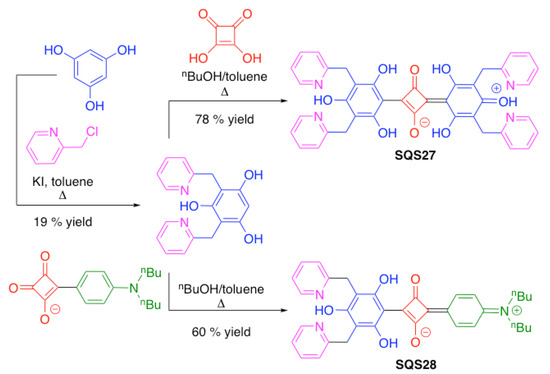 Other pyridine-containing squaraine-based sensors have also been reported. Specifically, SQS27 and SQS28 were prepared in a straightforward manner (Scheme 10) [96]. SQS27 provided a naked-eye determination of Cu2+ ions; the absorption maximum of SQS27 (λabmax = 514 nm; pink-colored solution) underwent a drastic shift to the red region (λabmax = 680 nm; blue-colored solution). Upon addition of EDTA, the pink color of SQS27 was restored, thus indicating a reversible nature of the SQS27–Cu interaction. Significantly, no pronounced changes were observed in the presence of 26 metal ions, including alkaline, alkaline-earth, transition, heavy metal, and lanthanides. It was determined that the one-to-one SQS27–Cu complex had Kd = 0.5 μM. Furthermore, Cu selectivity was observed when the emission spectra of SQS27 were recorded in the presence of various metal ions; a six-fold decrease in the emission intensity (λemmax = 626 nm) was produced in the presence of only Cu2+. The possibility of SQS27 having Cu-sensing ability in a biological setting was tested using LL/2 and HepG2 cell lines. A notable decrease in intracellular fluorescence, i.e., “turn-OFF” response, was detected when these cells (incubated with 20 μM SQS27) were treated with CuCl2 (100 μM). Virtually complete fluorescence recovery was observed upon addition of EDTA (500 μM).