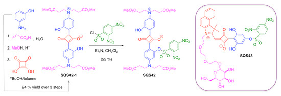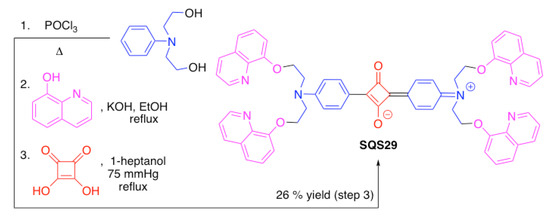 The incorporation of a quinoline moiety on squaraine’s scaffold was achieved in three steps, to give SQS29 (Scheme 11) [97]. Unlike many squaraines, SQS29 appeared to be relatively soluble in water, without significant aggregate formation. Specifically, the intensity of a narrow absorption peak (λabmax = 645 nm) in ethanol (EtOH, 100%) decreased only by ca. 7% when the water content was increased from 0 to 70%, without any appreciable broadening of the peak or shift of the λabmax. Although, in 100% water, a ca. 1.8-fold decrease in absorption intensity was observed, neither the width nor the λabmax of the peak changed. The fluorescent intensity of SQS29 (λemmax = 664 nm) was largely unaffected when the water content varied from 0 to 70% in EtOH.