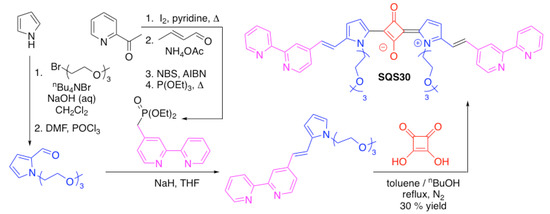 Bipyridyl is a common binding motif for a variety of transition and heavy metal ions [90]. The incorporation of bipyridyl into the squaraine scaffold was achieved following a multi-step synthetic route, to give SQS30 (Scheme 12) [98]. This sensor was prone to aggregation in the presence of water, as the formation of non-emissive, H-type aggregates, with a low molar extinction coefficient, was observed. Thus, all fluorescent studies involving analytes were conducted in acetone. It was found that in the presence of increasing amounts of Zn2+ ions, a decrease in the emission maximum at 698 nm, with a concurrent increase in the maximum at 720 nm, was noted. Furthermore, the absorption spectrum of SQS30 revealed a bathochromic shift (from 680 nm to 695 nm) in the presence of Zn2+. Based on these spectroscopic data, the detection limit for Zn2+ was estimated to be ca. 60 nM. Noteworthy, SQS30 showed a complex fluorescence emission response to other metal ions; for example, SQS30 became completely non-emissive above 680 nm in the presence of Cd2+, Cu2+, Co2+, and Ni2+, whereas a ca. 10-fold decrease in emission intensity (λemmax = 698 nm, i.e., no shift in the SQS30 maximum) was observed in the presence of Ag+.