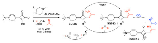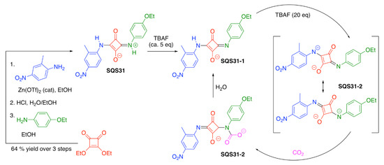 By taking advantage of the fairly acidic nature of NH, a N-nucleophilic-based CO2 sensor SQS31 was introduced (Scheme 13). SQS31 was synthesized in a fairly straightforward manner, starting with diethyl squarate [99]. In the presence of less than 5 equiv. of tetrabutylammonium fluoride (TBAF, with F− acting as a base), the yellow-colored SQS31 solution in DMSO (λabmax = 445 nm) changed to a purple-colored solution (λabmax = 525 nm) SQS31-1. When an excess of F− was used (ca. 20 equiv. of TBAF), a green solution (λabmax = 655 nm), attributed to the delocalized di-anion SQS31-2, was obtained. Although other halides did not deprotonate SQS31 (due to low/non-existent basicity), NH4OAc was able to induce similar changes in the absorption spectra of SQS31 (both qualitatively and quantitatively). Arguably, by adjusting the electronic demands of the substituents on the squaraine core, the acidity of the NH could be modulated to yield sensors towards various bases.