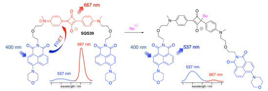 - Yu, H.; Fu, M.; Xiao, Y. Switching off FRET by analyte-induced decomposition of squaraine energy acceptor: A concept to transform ‘turn off’ chemodosimeter into ratiometirc sensors. Phys. Chem. Chem. Phys. 2010, 12, 7386–7391. [Google Scholar] [CrossRef]