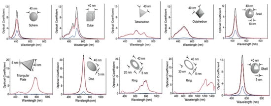 The LSPR effect of nanoparticles is often exploited due to the presence of very intense and well recognizable signals at certain wavelengths; furthermore, these signals also carry information regarding the shape and size of the nanoparticles (see Figure 3) [].