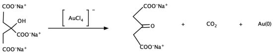 One of the most famous methods for AuNPs preparation is the 1951 Turkevich synthesis [], in which HAuCl4 is dissolved in deionized water and the solution is heated until it boils; then a solution of sodium citrate is added under stirring. The color of the solution will gradually change from yellow to grey, to purple, to deep purple, to finally dark red. First, the sodium citrate reacts as a reducing agent, then as a stabilizer because the negatively charged ions are adsorbed on the nanoparticles’ surface, preventing aggregation. In this case, the surface of the nanoparticles is negatively charged. This method is very reproducible, and the nanoparticles have a low polydispersity. Scheme 2 shows the reduction mechanism of Au(III) by sodium citrate. The same method was applied to AgNPs synthesis, but it was necessary to use a stronger reducing agent such as NaBH4 while sodium citrate was still used as a capping agent [].