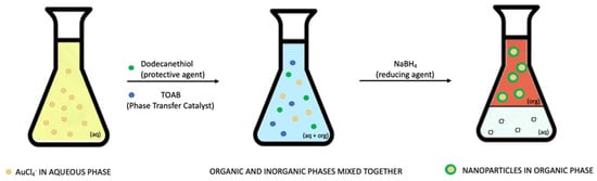One of the problems of the synthesis in water is the trouble of obtaining NPs in the solid phase; indeed, upon removing the solvent, the particles tend to aggregate. A possible solution to this problem is a biphasic synthesis. The best-known method is the 1994 Brust-Schiffrin synthesis []. In this procedure, the metal salt is dissolved in water and carried into an organic phase (toluene) thanks to a phase transfer reagent (tetraoctylammonium bromide, TOAB), which will be reduced with a water solution of NaBH4 in the presence of dodecanethiol as a protective agent. In this case, NPs are capped with thiol and might be precipitated, evaporating the solvent with ethanol in addition (see Scheme 3) [].