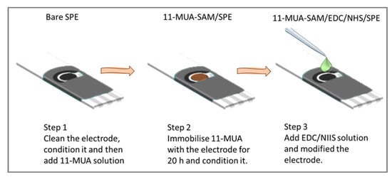 34]. Electrode surfaces provide no sites for covalent bonding, making it necessary to coat a thin film of functional groups to covalently bond with the amino groups of the used antibodies [