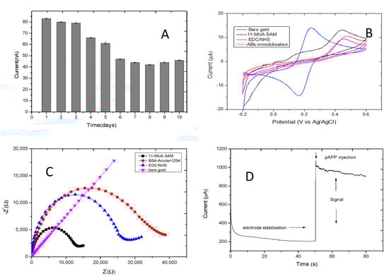 A stability study was performed on the coated BSA-Aroclor 1254 coating conjugate on the gold electrodes by immobilizing the electrodes with a few layers of the assay components, which is similar to the steps mentioned in