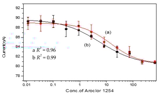 The specificity was determined by testing the cross-reactivity (CR) of the antibody with a variety of Aroclors. The reaction was carried out using liner sweep voltammetry (LSV) by adding these compounds (instead of Aroclor 1254 in the respective assays) at 11 serial dilutions, using the same concentration range (0.01 to 660 ng mL