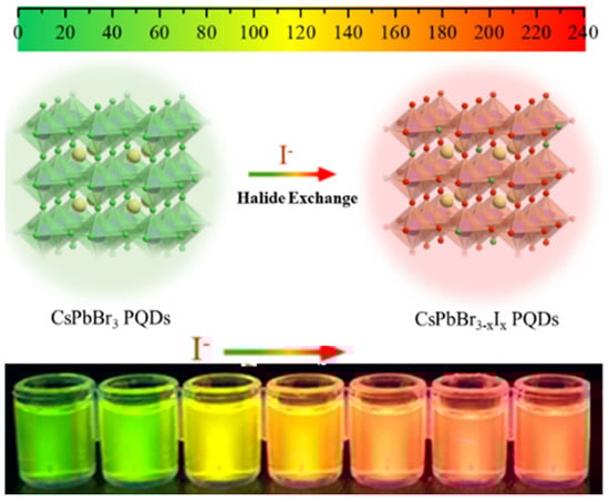 In halide perovskite ABX3, X is the halogen anion (Cl−, Br−, or I−), A is the monovalent cation Cs+ CH3NH3+ (MA) or CH(NH2)2+ (FA), and B is a divalent metallic cation, such as Pb2+, Sn2+, or Ge2+. Although the discovery of halogen perovskites can be traced back to 1958 [], they did not attract much attention until the study of Miyasaka et al. using MAPbI3 for solar cells in 2009; the research upsurge of lead halide perovskites (LHPs) attracted wide attention in relevant fields []. The photogenerated electrons and holes of LHPs can not only be separated to produce an electric current, but can also be combined to produce light through radiation. LHPs have the characteristics of narrow emission peak, high color purity, and accurate adjustment of emission wavelength through halogen composition in the whole visible region, which indicates application potential in lighting [,,], optical display [,,], laser [,], and optical sensing and detection [,,]. However, the fluorescence quantum yield (PLQY) of the macro-sized LHPs is generally not very high, since (a) LHPs have a low generation energy of ion defects (especially halogen defects) and are prone to produce a large number of ion vacancy defects during crystallization; and (b) LHPs have low exciton binding energy, resulting in low electron-hole radiative recombination efficiency. Therefore, researchers have turned their attention to lead halide perovskite nanocrystals (CsPbBr3 NCs), in an attempt to improve the exciton binding energy and radiation recombination efficiency of LHPs by enhancing the quantum confined effect []. In 2014, Perez-Prieto et al. first reported the synthesis of MAPbBr3 NCs, whose PLQY could be closer to 20% []. In 2015, Kovalenko et al. synthesized and obtained 90% all-inorganic CsPbX3 NCs for the first time [], which started the vigorous development of CsPbBr3 NCs in the field of luminescence. As shown in Figure 1, the halogen exchange characteristics of CsPbX3 NCs cause the wavelength shift of their fluorescence emission []. Generally, the redshift of fluorescence wavelength occurs with the increase of X ion radius. For example, iodide can exchange Br in CsPbBr3 PNCs, and result in the corresponding generation of CsPbBrxI3−x (0 ≤ x ≤ 3). The fluorescence emission wavelength of CsPbBrxI3−x gradually redshifts with the increase of iodine concentration, and the apparent color changes from green to red. The wavelength change has a linear relationship with the concentration of I−, which is veryuseful in colorimetric sensing for an oxidative substance due to the reduction property of iodide (I2 + 2e−→2I−, with E°-0.54 V vs. SHE).