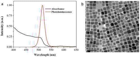 Absorbance and fluorescence spectra of the synthesized CsPbBr3 PNCs (a) and their TEM images (b).