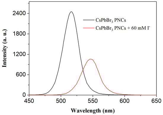 Fluorescence spectra of halide exchanges between CsPbBr3 PNCs hexane and NaI aqueous solution (60 mmol L−1).