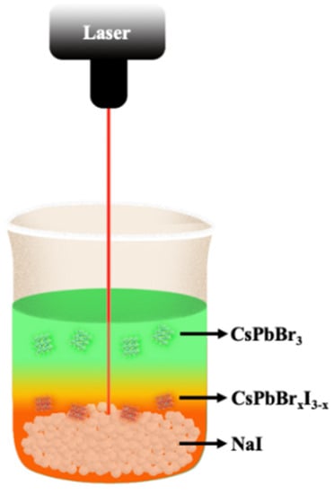 - Hoffman, J.B.; Schleper, A.L.; Kamat, P.V. Transformation of Sintered CsPbBr3 Nanocrystals to Cubic CsPbI3 and Gradient CsPbBrxI3–x through Halide Exchange. J. Am. Chem. Soc. 2016, 138, 8603–8611. [Google Scholar] [CrossRef] [PubMed]