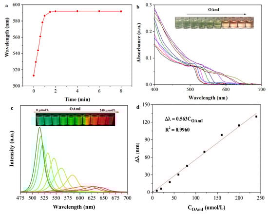 (a) The wavelength changes of CsPbBr3 PNCs with halide exchanges of 120 μmol L−1 OLAM-I at different times; (b,c) the band edge absorption and PL spectra changes when CsPbBr3 PNCs halide exchange with OLAM-I of different concentration from 0~240 μmol L−1; (d) the relationship between the concentration of OLAM-I and the wavelength-shift.